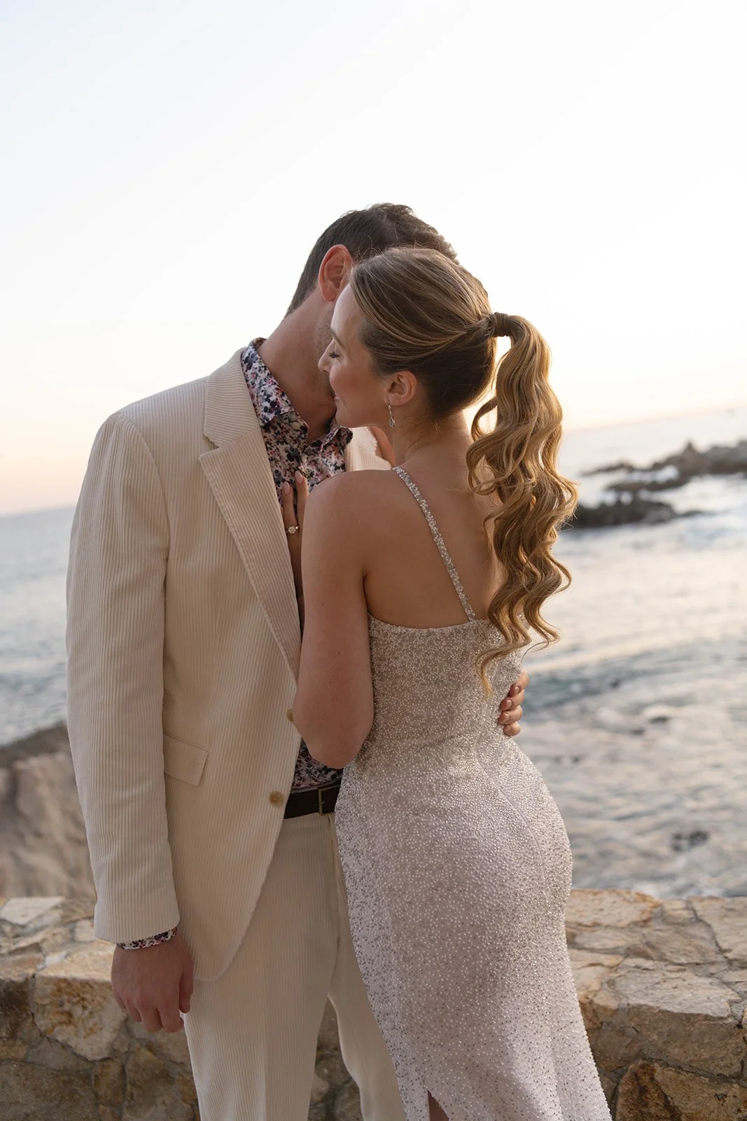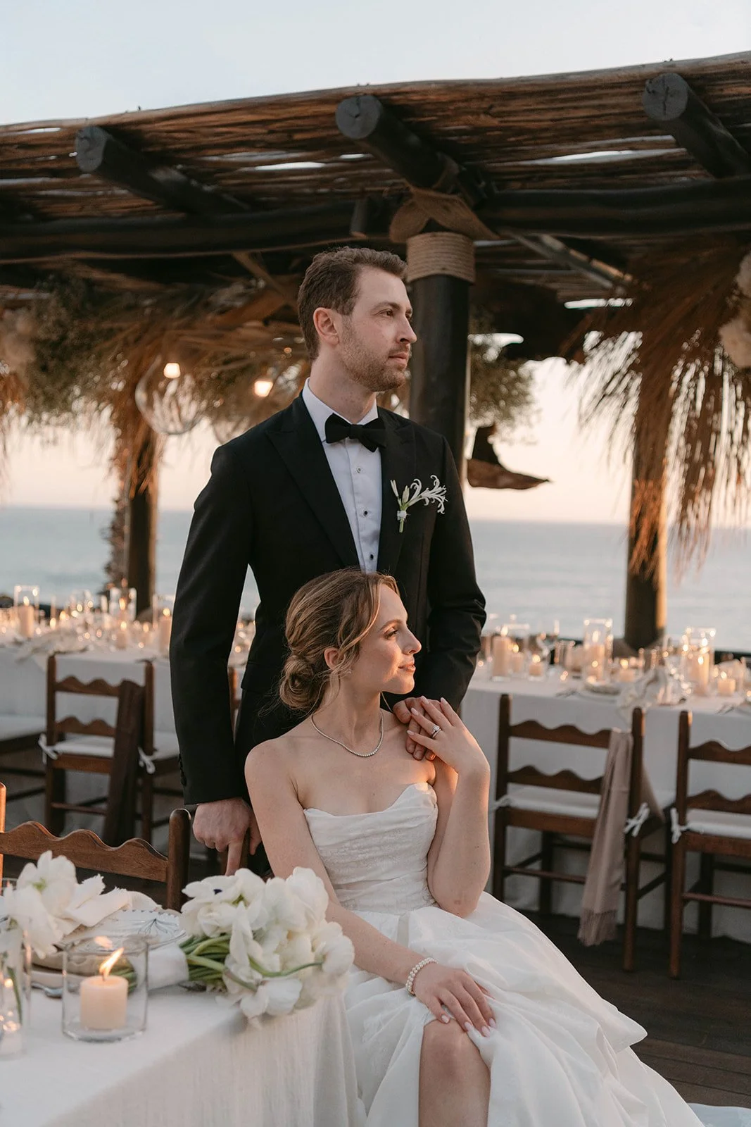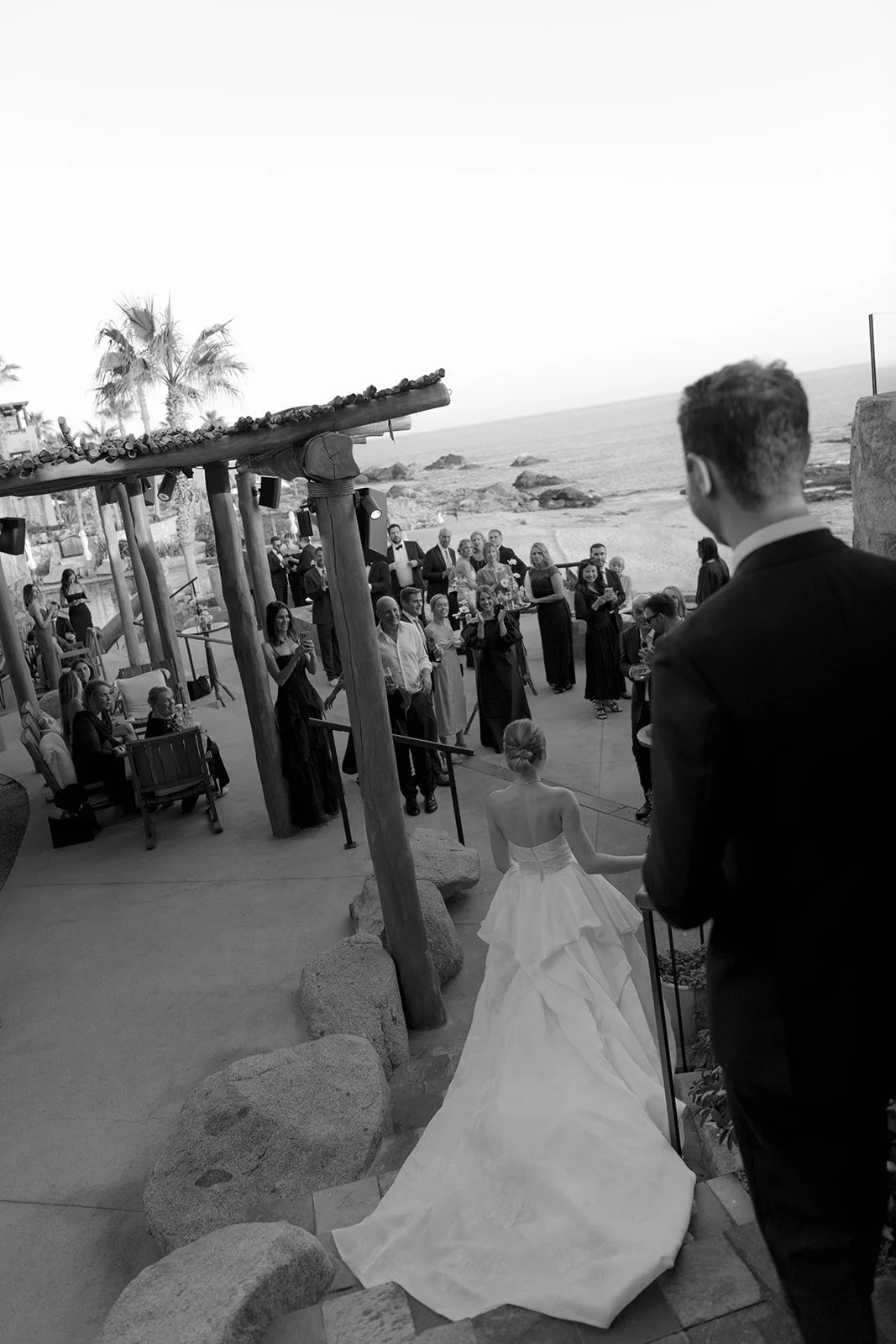 Light moved slowly across the room as he adjusted his bow tie, laughing with his closest friends. There was ease in the air. No rush. No nerves. Just anticipation. Down the hall, she stepped into her gown as if she had been waiting for this exact version of herself. The way the fabric fell. The way everyone paused for a second when they saw her. These are the moments I look for — the ones that happen before the aisle.Set high above the Sea of Cortez, the ceremony unfolded against endless blue. The florals were soft, intentional, never competing with the view. Wind moved gently through the grasses. Guests leaned in. Vows were spoken slowly — like they wanted to remember every word.Cliffside ceremonies have a different kind of gravity. The horizon stretches wide, and somehow everything becomes both expansive and intimate at the same time. When they reached for each other’s hands, it wasn’t dramatic — it was steady. Confident. The kind of love that doesn’t perform. The kind that simply is.Golden hour wrapped the terrace in warmth as they walked back down the aisle married. Applause behind them. Ocean below them. A new chapter beginning in full light. Dinner was layered in candlelight and linen, wood beams overhead, the sea just beyond. Toasts turned into tears. Tears into laughter. The energy shifted from reverent to electric without ever losing its elegance. Esperanza doesn’t overpower a wedding. It frames it. It allows the people — the glances, the embraces, the in-between moments — to remain the center. And that’s what I carry with me from this day. Not just the view. Not just the design. But the feeling of two people choosing each other, completely.