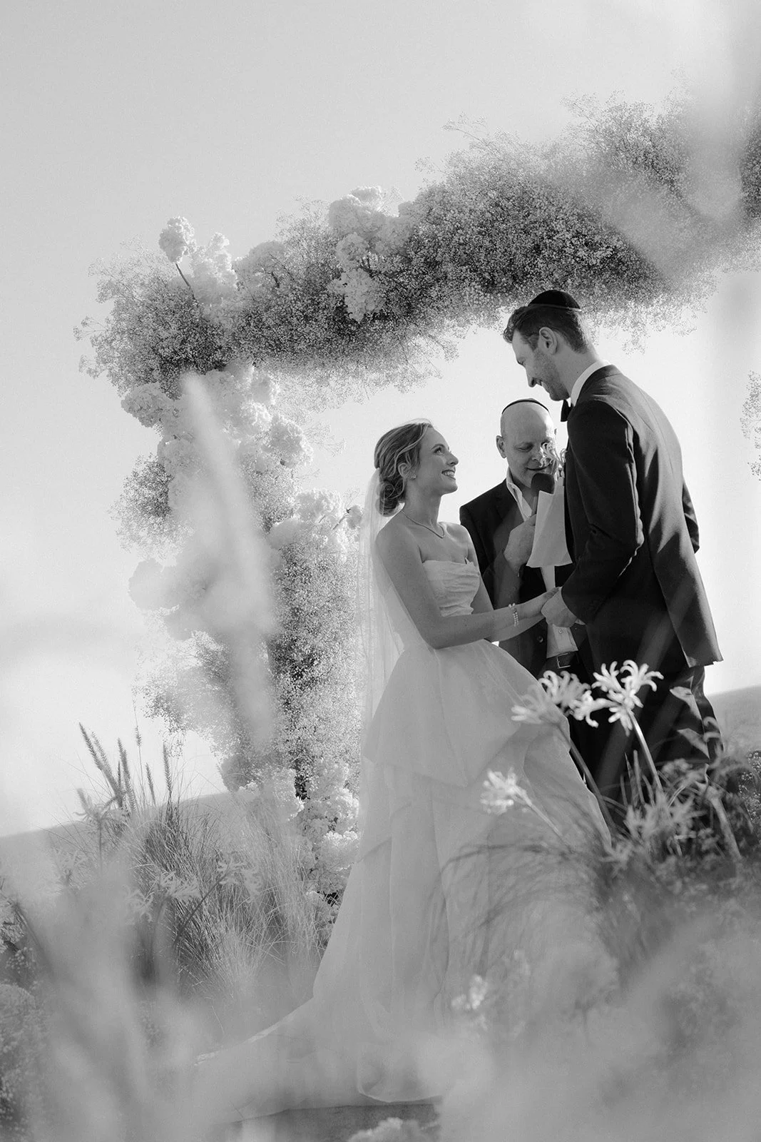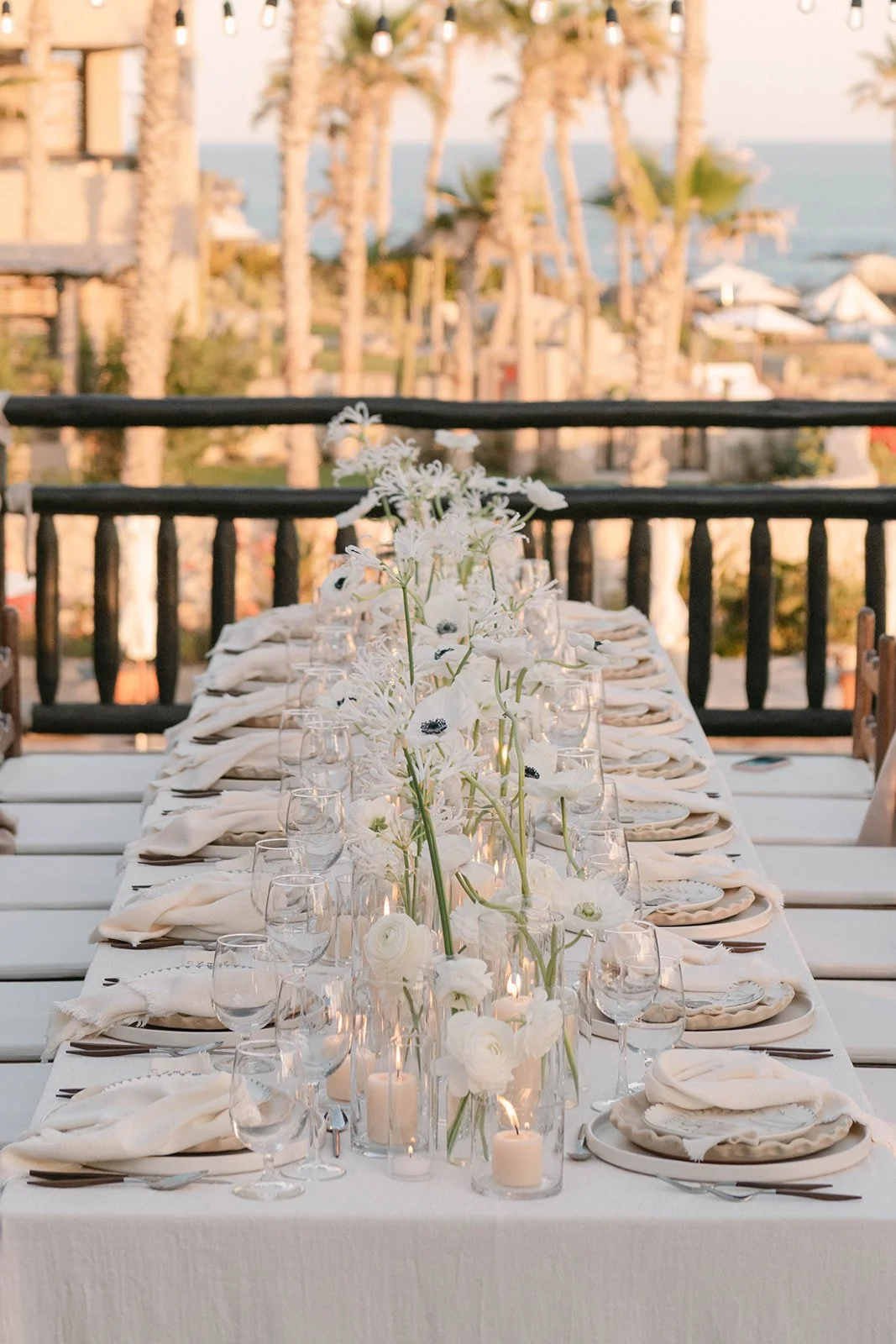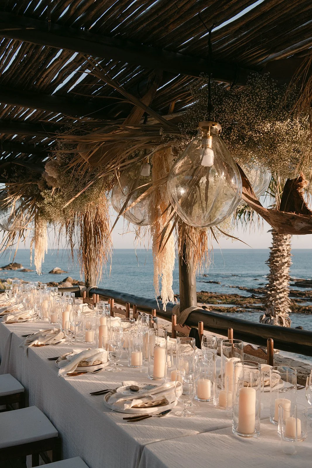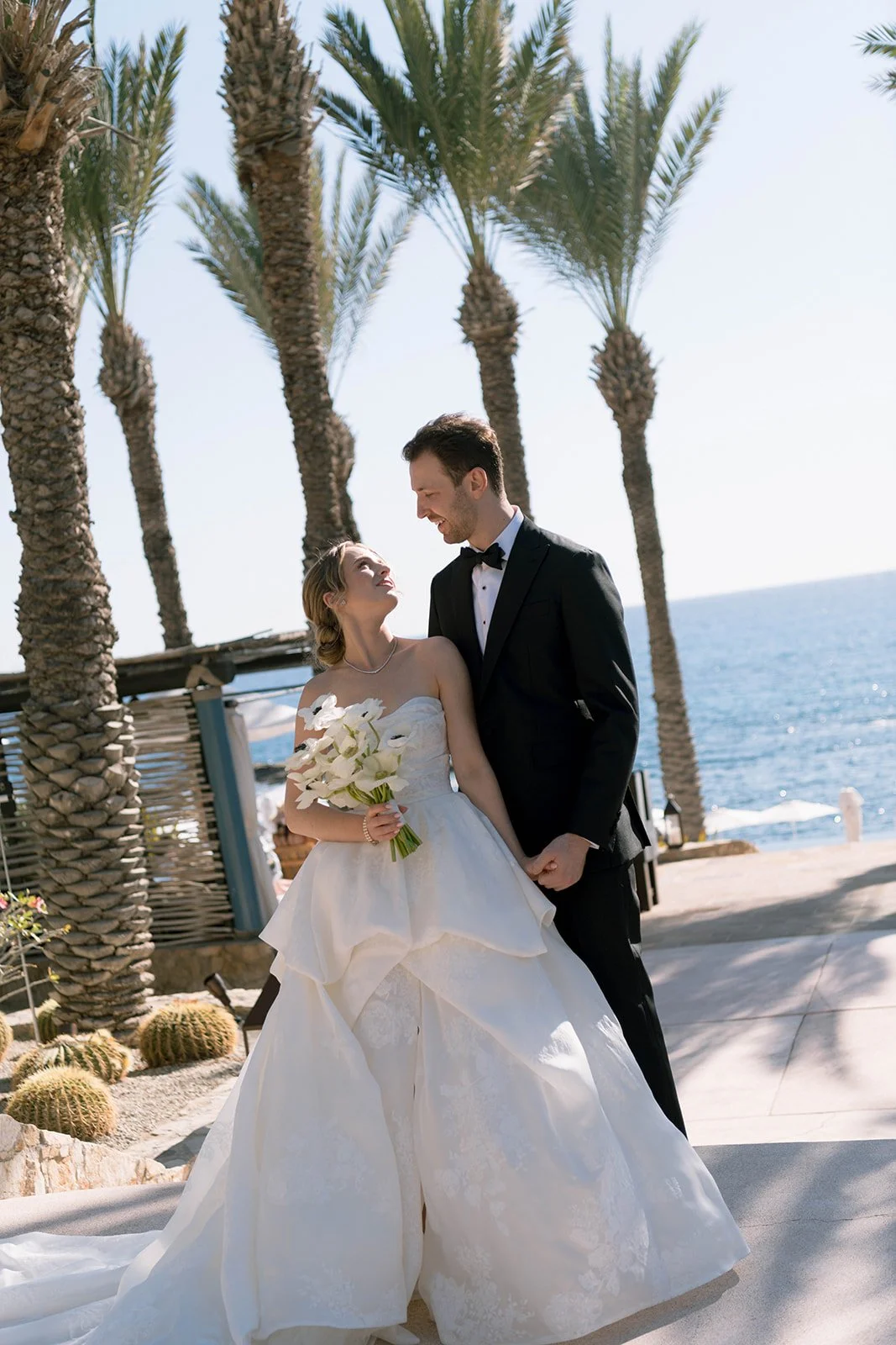Light moved slowly across the room as he adjusted his bow tie, laughing with his closest friends. There was ease in the air. No rush. No nerves. Just anticipation. Down the hall, she stepped into her gown as if she had been waiting for this exact version of herself. The way the fabric fell. The way everyone paused for a second when they saw her. These are the moments I look for — the ones that happen before the aisle.Set high above the Sea of Cortez, the ceremony unfolded against endless blue. The florals were soft, intentional, never competing with the view. Wind moved gently through the grasses. Guests leaned in. Vows were spoken slowly — like they wanted to remember every word.Cliffside ceremonies have a different kind of gravity. The horizon stretches wide, and somehow everything becomes both expansive and intimate at the same time. When they reached for each other’s hands, it wasn’t dramatic — it was steady. Confident. The kind of love that doesn’t perform. The kind that simply is.Golden hour wrapped the terrace in warmth as they walked back down the aisle married. Applause behind them. Ocean below them. A new chapter beginning in full light. Dinner was layered in candlelight and linen, wood beams overhead, the sea just beyond. Toasts turned into tears. Tears into laughter. The energy shifted from reverent to electric without ever losing its elegance. Esperanza doesn’t overpower a wedding. It frames it. It allows the people — the glances, the embraces, the in-between moments — to remain the center. And that’s what I carry with me from this day. Not just the view. Not just the design. But the feeling of two people choosing each other, completely.